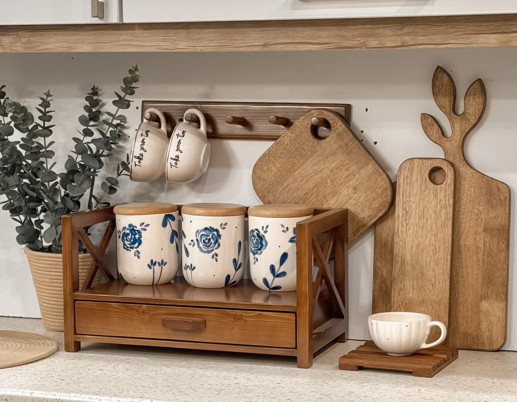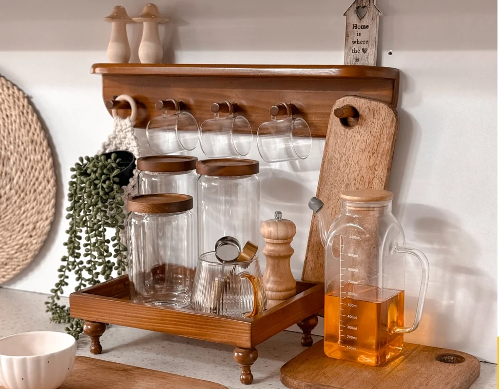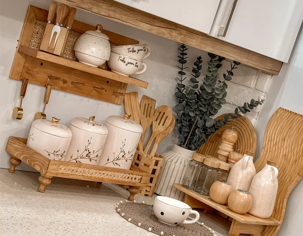 به جای اینکه ادویهها، قاشقها یا وسایل دم دستی رو مستقیم روی کانتر بذاری، از ظروف چوبی و جعبههای کوچک استفاده کن.
