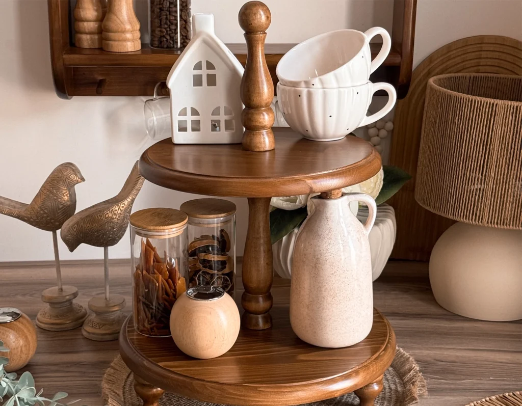 🪵 ۱. استفاده از سینی چوبی برای نظمدهی و دکور